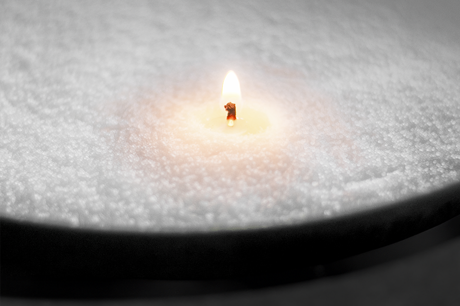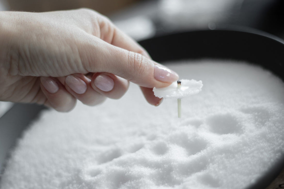Setze den gewĂŒnschten Docht in die Mitte des Kerzenschnees und zĂŒnde ihn an. Der Kerzenschnee beginnt gleichmĂ€ssig zu schmelzen.